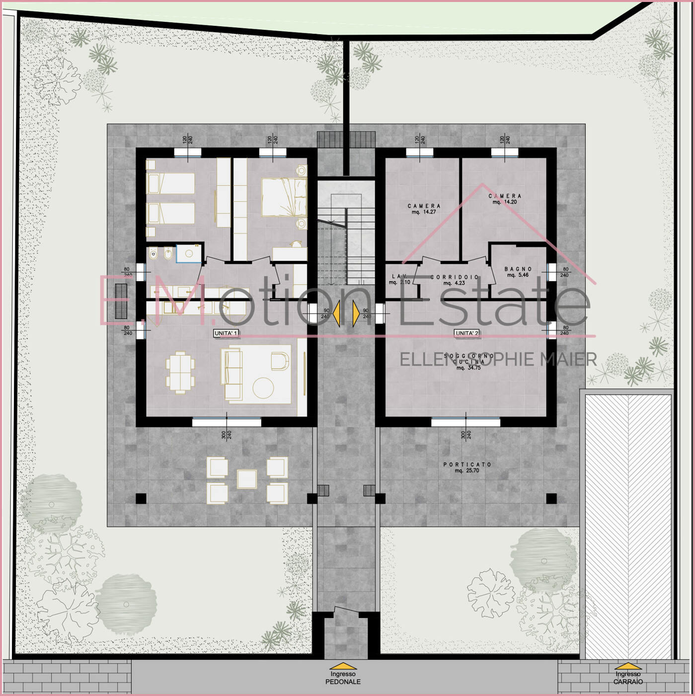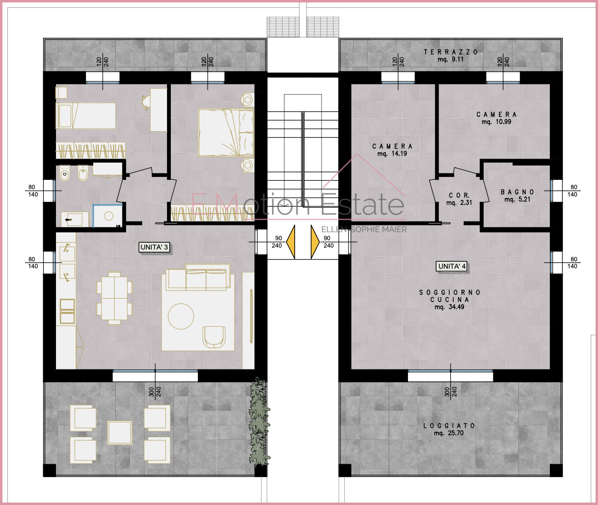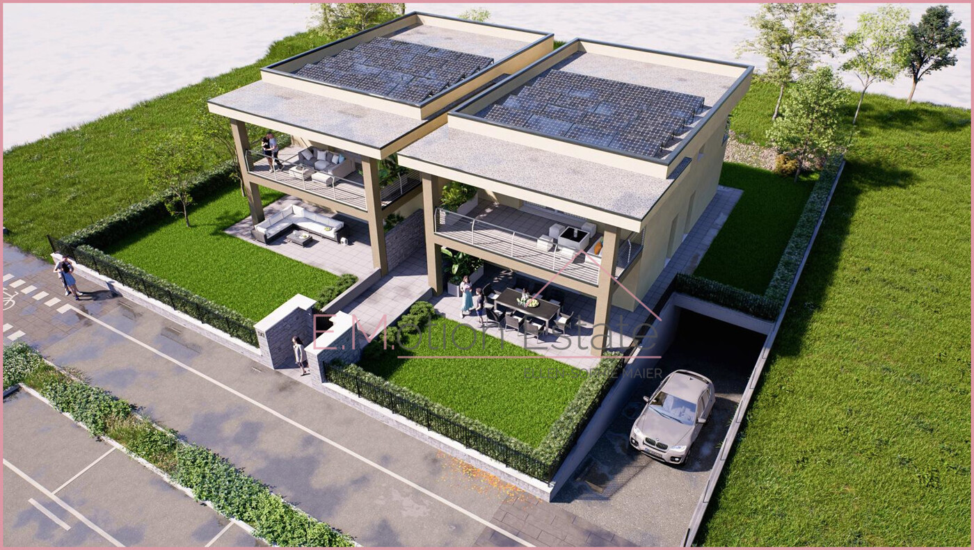 Die „Residenza ZAIRA“ besteht aus zwei eleganten Gebäuden, die durch eine zentrale Treppe verbunden sind. Jedes der Gebäude umfasst zwei oberirdische Stockwerke sowie ein gemeinsames, großzügiges Untergeschoss. Die durchdachte Architektur garantiert Privatsphäre und Wohnqualität auf hohem Niveau.