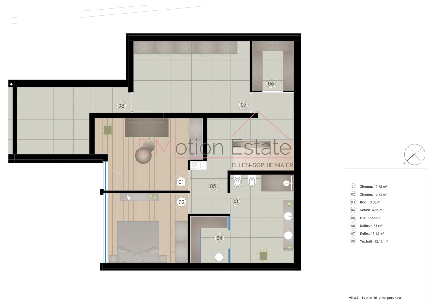 Im Untergeschoss ist ein Wellnessbereich vorgesehen. Die Anschlüsse für eine optionale Sauna werden bauseits vorbereitet; die Installation der Sauna erfolgt bei entsprechender Aufpreis Option. Die Installation einer finnischen Panoramasauna in Fichte kann auf Wunsch des Käufers gegen Aufpreis ausgeführt werden. Die optionale Sauna hat eine Größe von ca. 5m² bis 7 m² und bietet ausreichend Platz für mehrere Personen.