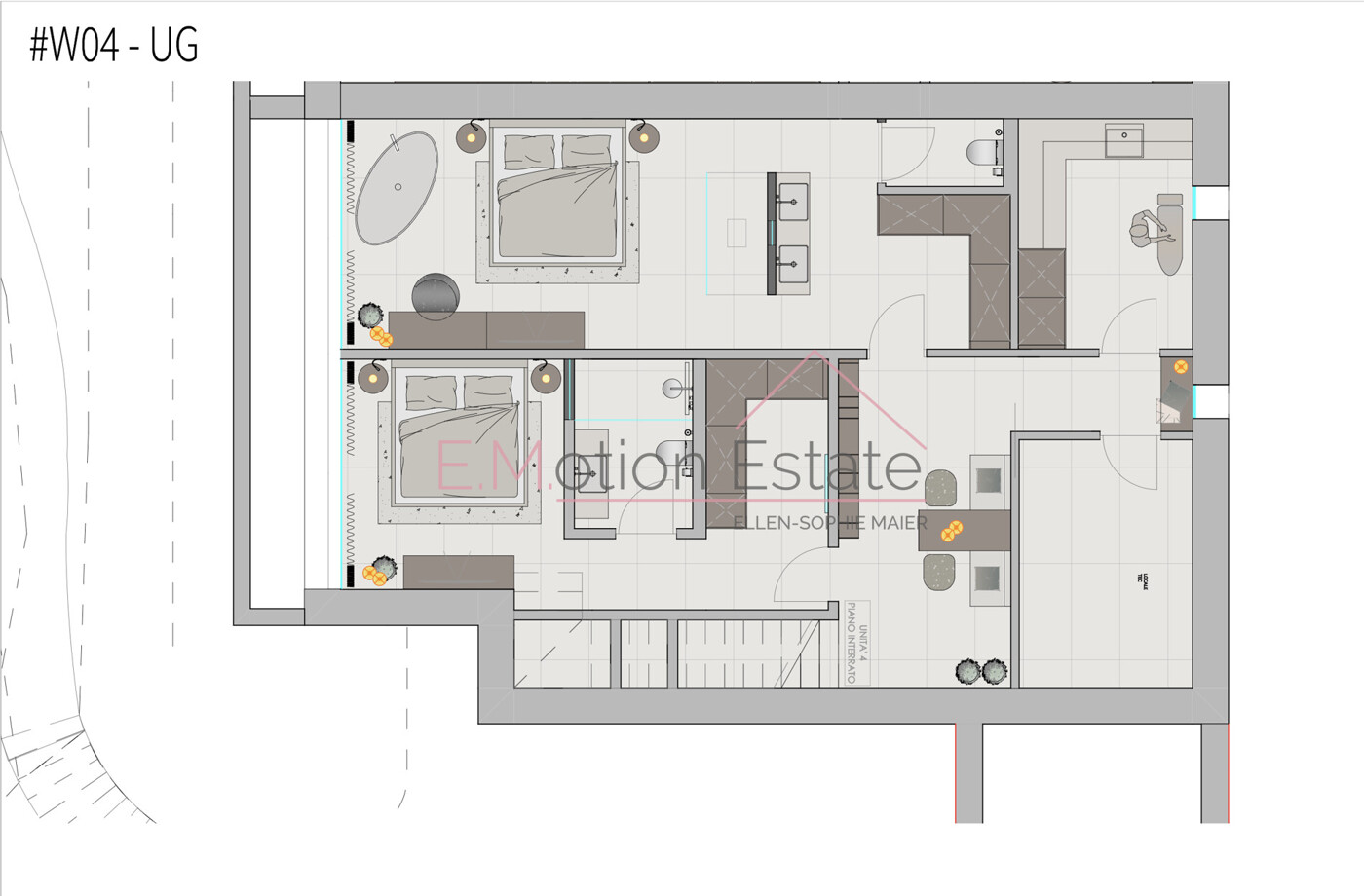 Die darunterliegende Gartenebene verfügt über zwei großzügige Schlafzimmer, die jeweils mit einem eigenen Bad ausgestattet sind und somit ein hohes Maß an Privatsphäre und Komfort für Familie, Gäste oder Homeoffice bieten. Ergänzt wird diese Ebene durch einen gemütlichen Sitzbereich und den praktischen Hauswirtschaftsraum, der funktionale Abläufe elegant unterstützt.
