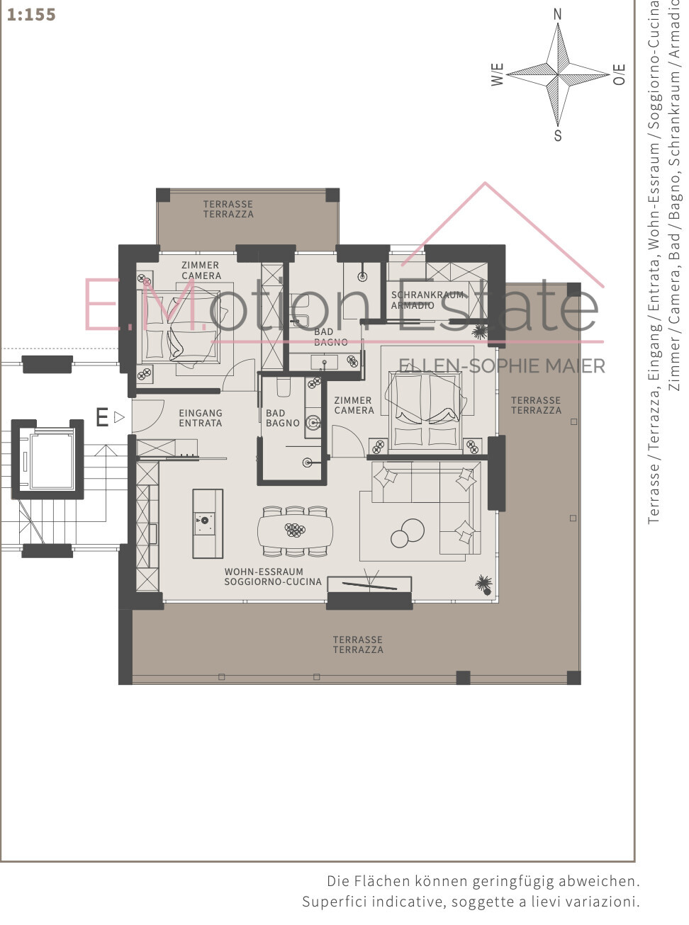 Ein besonderes Highlight ist der umlaufende, L-förmige Balkon, der den Wohn- und Essbereich in attraktiver Süd-Ost-Ausrichtung umschließt. Dank dieser Lage genießen Sie zu jeder Tageszeit sonnige Stunden und ein außergewöhnliches Wohngefühl im Freien.